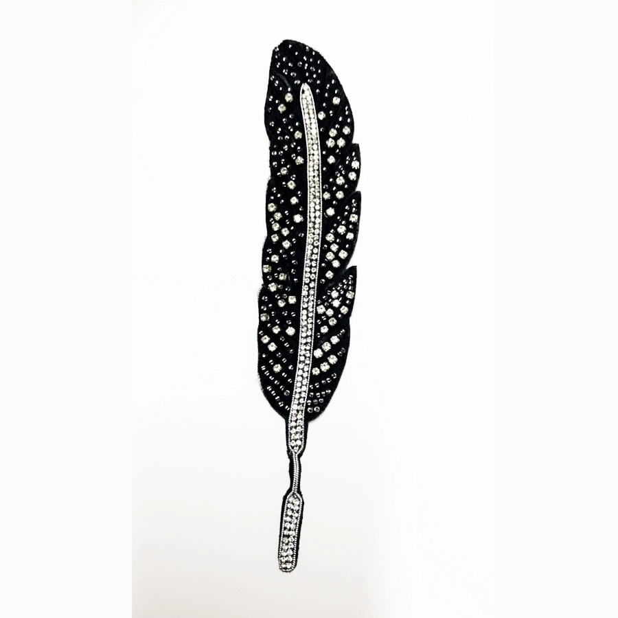This elegant handcrafted embroidery patch features a sleek feather design, created using detailed beadwork and hand embroidery techniques. The elongated shape of the feather is highlighted with a central line of closely set beads, while the surrounding surface is decorated with finely placed stones and bead accents, giving it a refined and sophisticated look.