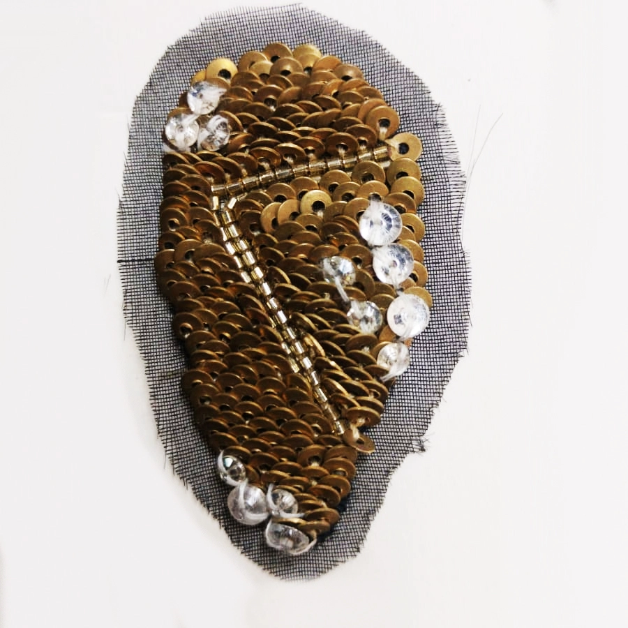 This elegant handcrafted embroidery patch features a refined design created with densely arranged gold sequins and highlighted crystal embellishments. The composition is carefully structured to form a smooth, reflective surface that captures light beautifully, giving it a rich and sophisticated appearance.