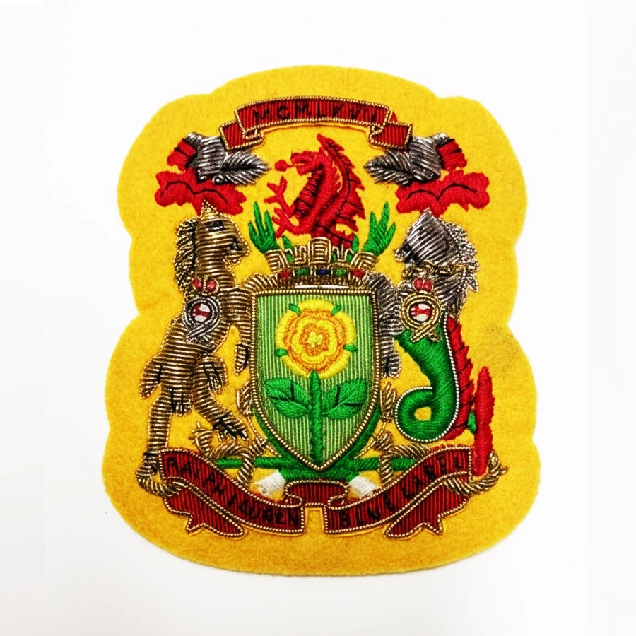 This finely crafted bullion embroidery badge showcases a regal crest design inspired by classic heraldic emblems. The composition features intricately detailed animal figures, ornamental motifs, and a central shield, all brought to life through high-quality metallic bullion work and vibrant thread embroidery. The rich yellow base enhances the overall visual impact, giving the design a bold and prestigious appearance.